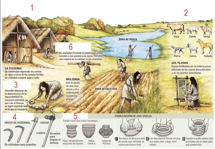- El Neolítico, cuando los humanos comenzaron a ser agricultores y ganaderos y a vivir en pequeñas aldeas